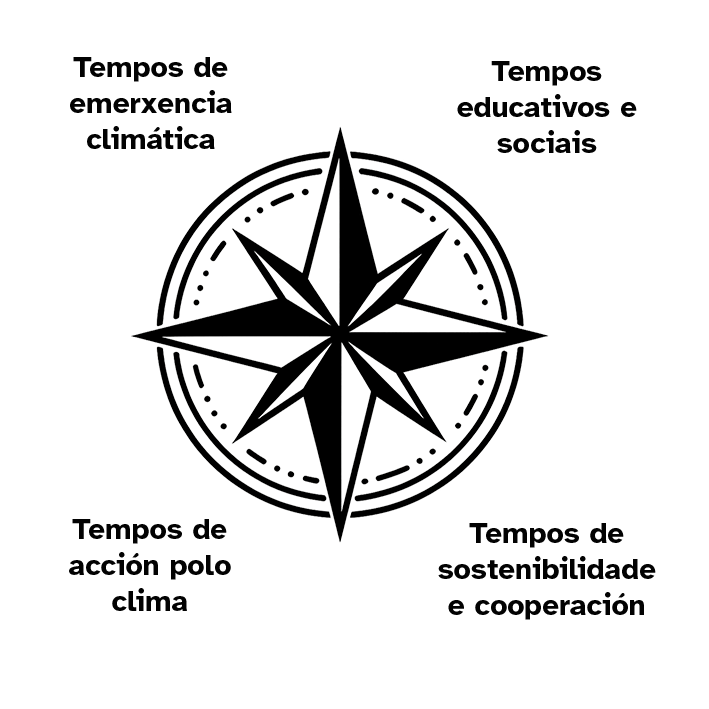 Sen pretensión de perder o norte ou dar receitas ao sur, nin de reconciliar o leste co oeste, neste Congreso adoptamos estes catro Tempos como eixes transversais ou orientacións cardinais que guíen e doten de marcos de diálogo, diagnóstico e deseño colectivo de propostas para o desenvolvemento de políticas públicas -climáticas e educativas-, de praxes educativas pertinentes e de novas liñas de investigación para afrontar os desafíos climáticos, ambientais e sociais contemporáneos.
